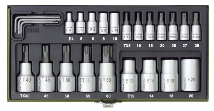 TX screwdriver bits for 1/4" drive (6.3 mm) from size TX 8 to TX 30 (with front-end bore) and external TX size E 4 to E 10 (all tightening torques up to 25 Nm) for 1/2" drive (12.5 mm) sizes TX 40 - 60 and external TX E 12 - E 20 (for tightening torques from 25 - 135 Nm). Three angled wrenches TX 6, 8 and 10.
